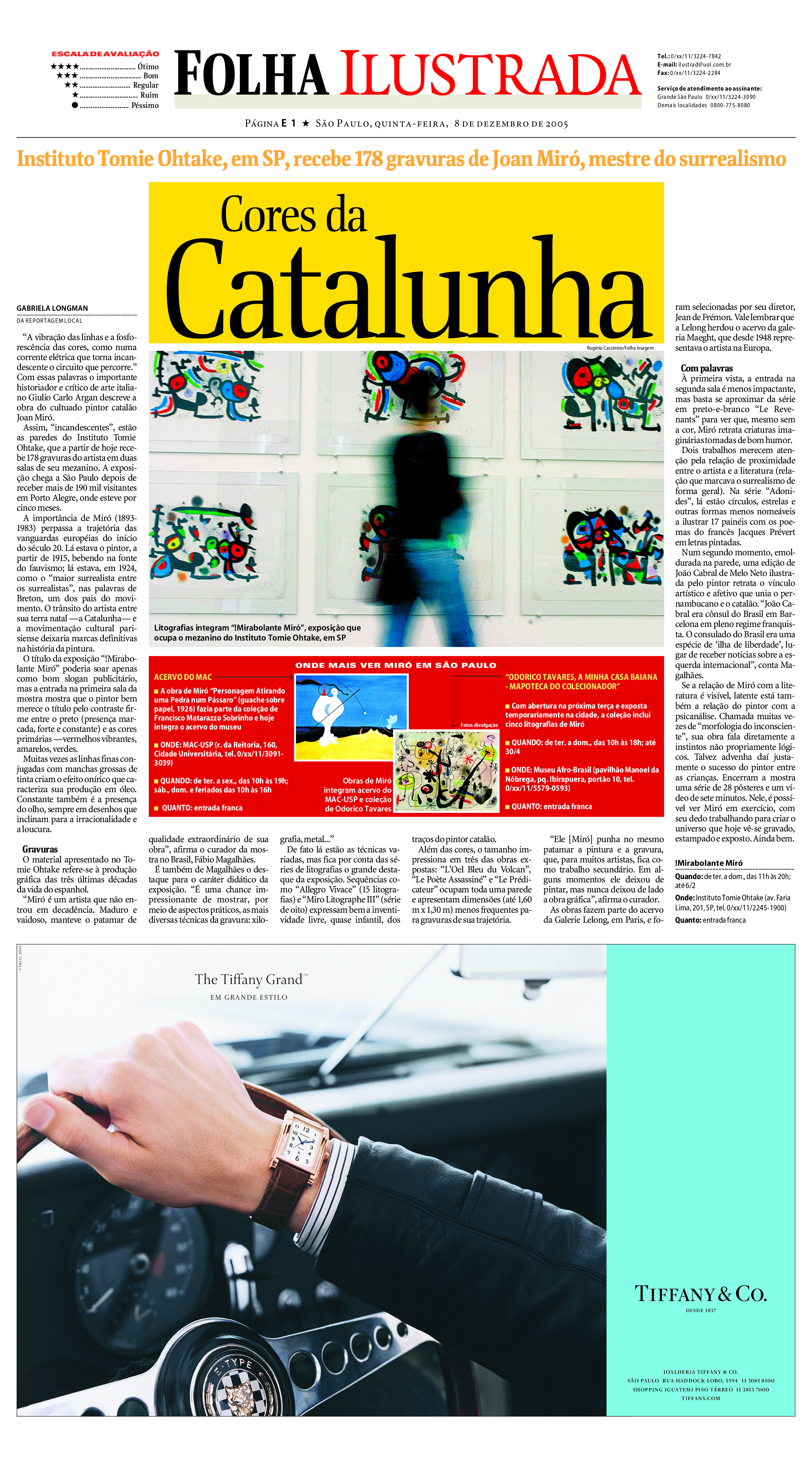 reportagem sobre a exposição “Mirabolante Miró”, realizada no Instituto Tomie Ohtake e com 178 gravuras do artista. Folha de S. Paulo, 2005.