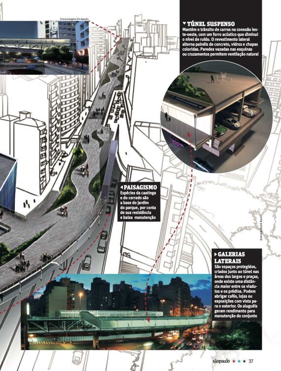 Reportagem sobre o projeto do “Novo Elevado”, criado pelos arquitetos José Alves e Juliana Corradini e que propõe a transformação do viaduto em um parque. 2010, revista sãopaulo, Folha de S. Paulo.