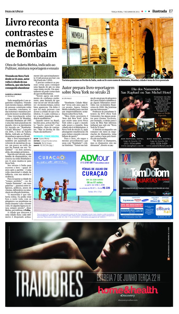 Entrevista com o autor Suketu Mehta, finalista do prêmio Pulitzer pelo livro “Bombaim: Cidade Máxima”. Folha de São Paulo, junho de 2011.