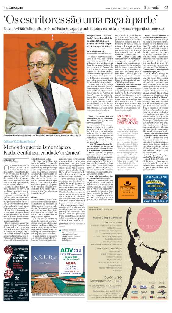 Entrevista com o escritor albanês Ismail Kadaré na ocasião do lançamento do livro “Crônica na pedra”, um relato sobre a Segunda Guerra Mundial em seu país de origem. 2008, Folha de S. Paulo.