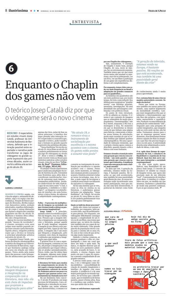 Entrevista com o professor Josep Català, da University Autònoma de Barcelona sobre o futuro dos videogames, e como ele poderia se tornar um suporte expressivo significativo no futuro. Ilustríssima, Folha de S. Paulo, 2011.