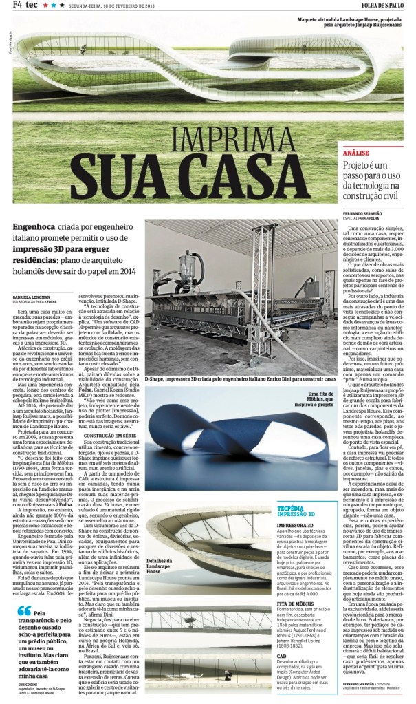 Entrevista com o arquiteto holandês Janjaap Ruijssenaars, responsável por projeto de casa feita a partir de impressão 3D. Folha de S. Paulo, 2013.