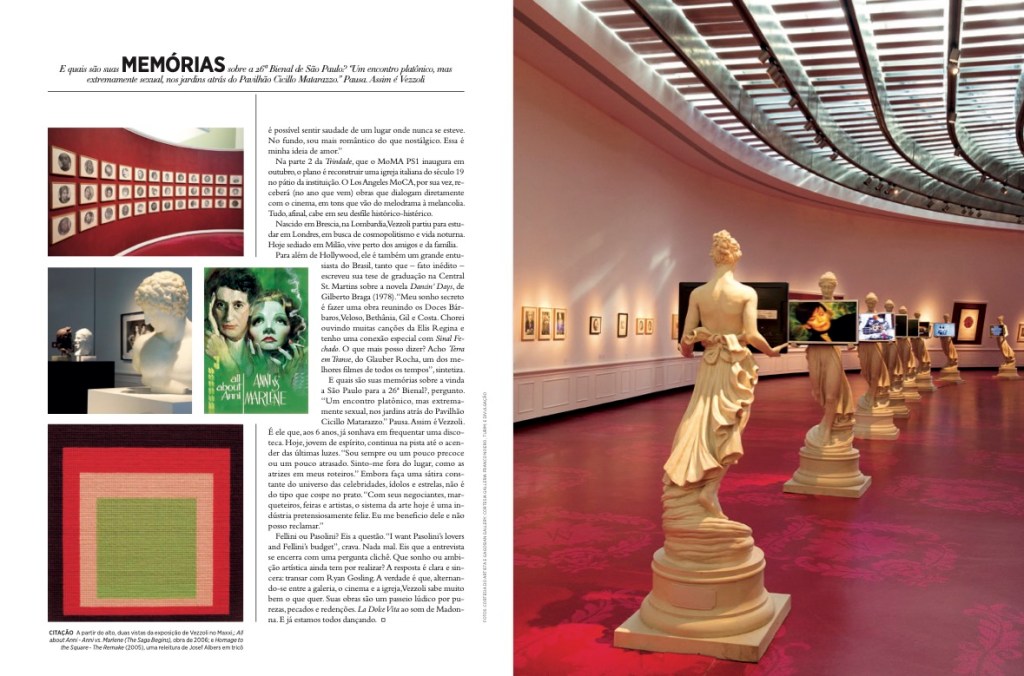 Entrevista com o artista italiano Francesco Vezzoli, artista que ja trabalhou com Miuccia Prada, Cate Blanchett e Sharon Stone e com obras expostas no MoMa PS1, Maxxi (Roma) e na 26a Bienal de Arte de São Paulo.