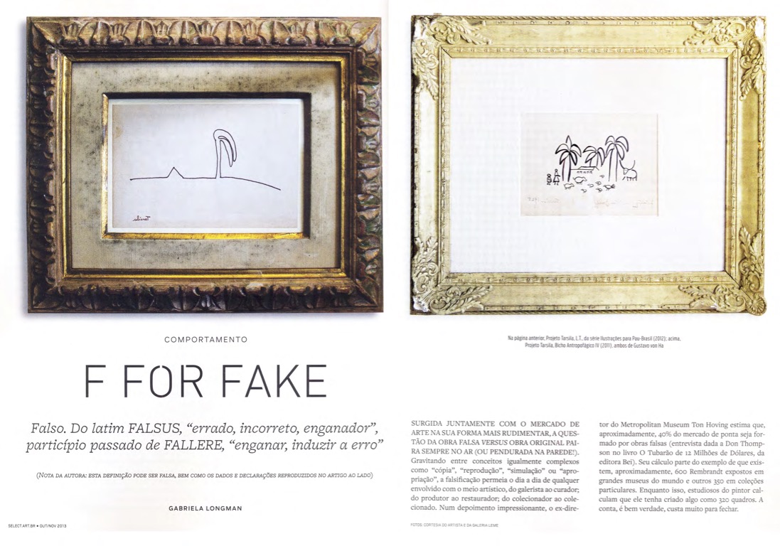 Reportagem discute a presença de falsificações dentro do circuito da arte. O texto também conta com uma entrevista com o artista Gustavo Von Ha, que desenvolveu uma série de trabalhos baseados justamente na ideia de falsificação, a partir de obras de Leonilson e Tarsila do Amaral. Revista Select, 2013.