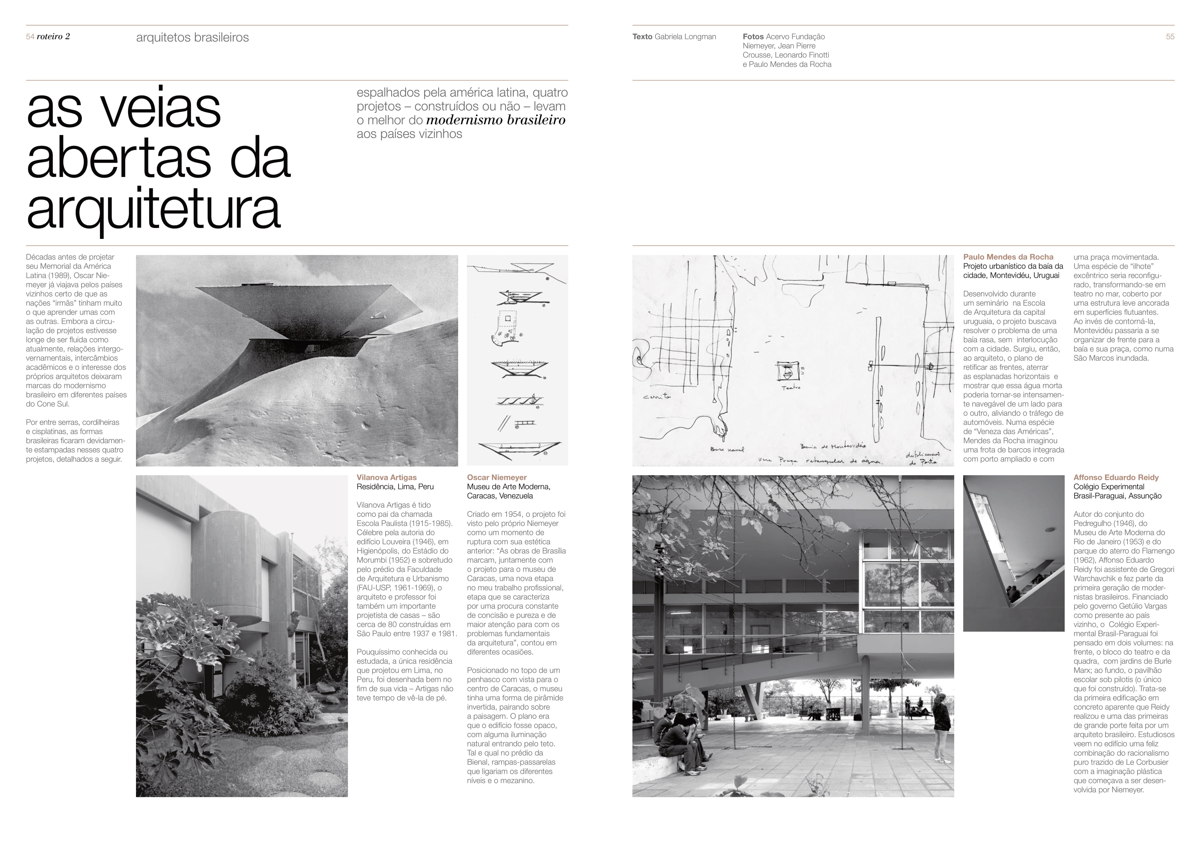 Reportagem sobre os projetos dos arquitetos modernistas Oscar Niemeyer, Vilanova Artigas, Paulo Mendes da Rocha e Affonso Eduardo Reidy espalhados pela América do Sul. Revista Bamboo.