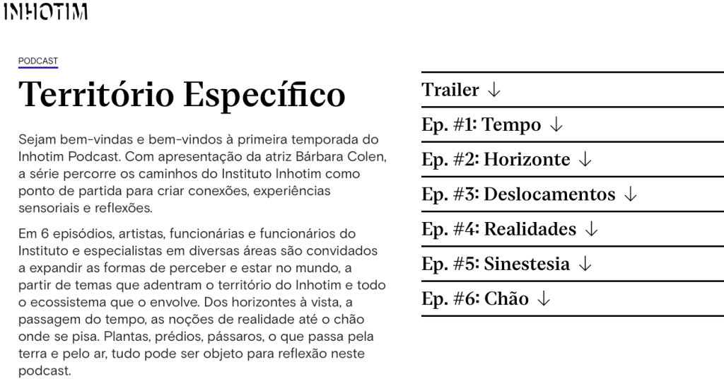Consultoria de roteiro e conteúdo, desenvolvimento dos temas, subtemas e questões abordadas em cada episódio. Elaboração da pauta das entrevistas com artistas, cientistas, acadêmicos, envolvendo os cruzamentos entre as artes e meio-ambiente. Trabalho com equipes multidisciplinares, com ênfase nos conteúdos em áudio para um público amplo e essencialmente jovem.